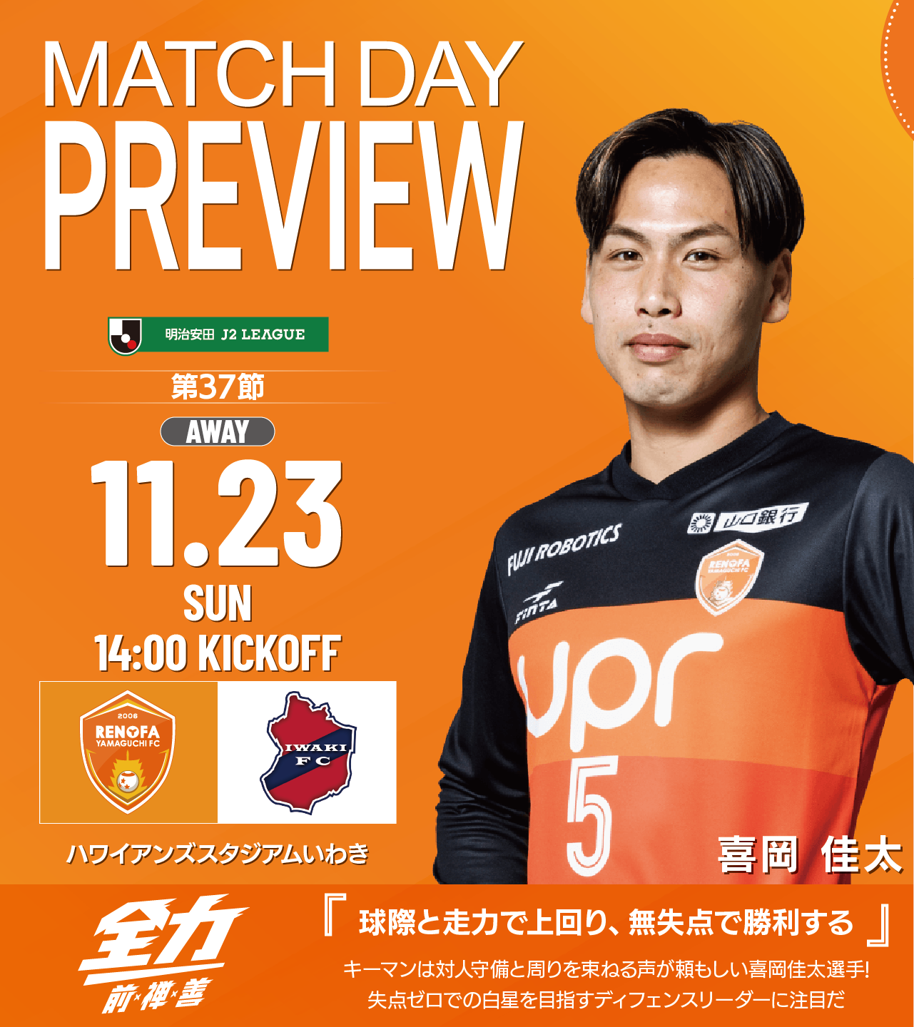 運命を左右する一戦となるレノファといわきの試合は11月23日午後2時キックオフ。残留争いの直接のライバルとなる熊本の試合は午後4時キックオフのため、試合中に熊本のスコアを気にしなくてよいのはポジティブだと言えそうだ。目の前の試合に集中し、勝つのみ!