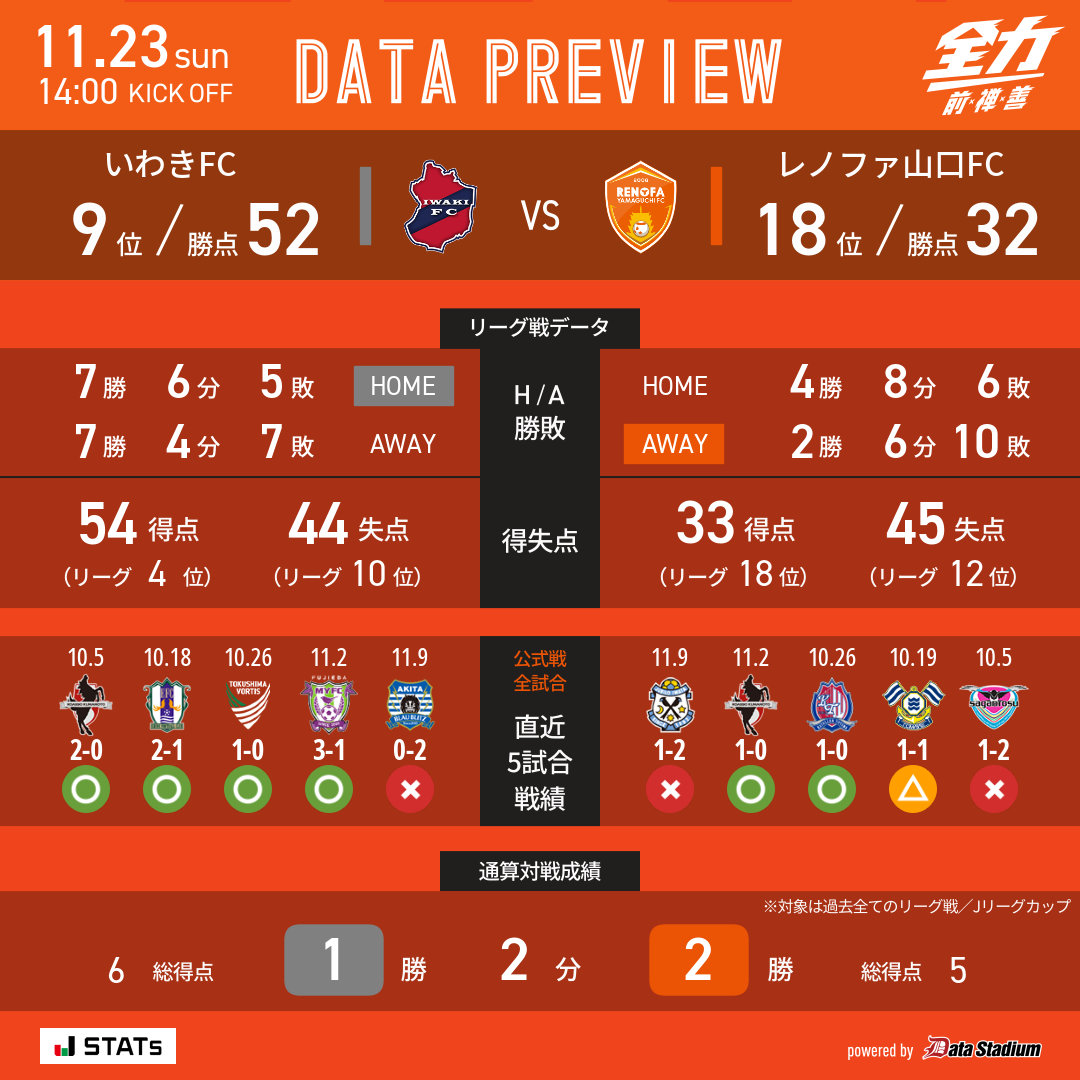 運命を左右する一戦となるレノファといわきの試合は11月23日午後2時キックオフ。残留争いの直接のライバルとなる熊本の試合は午後4時キックオフのため、試合中に熊本のスコアを気にしなくてよいのはポジティブだと言えそうだ。目の前の試合に集中し、勝つのみ!