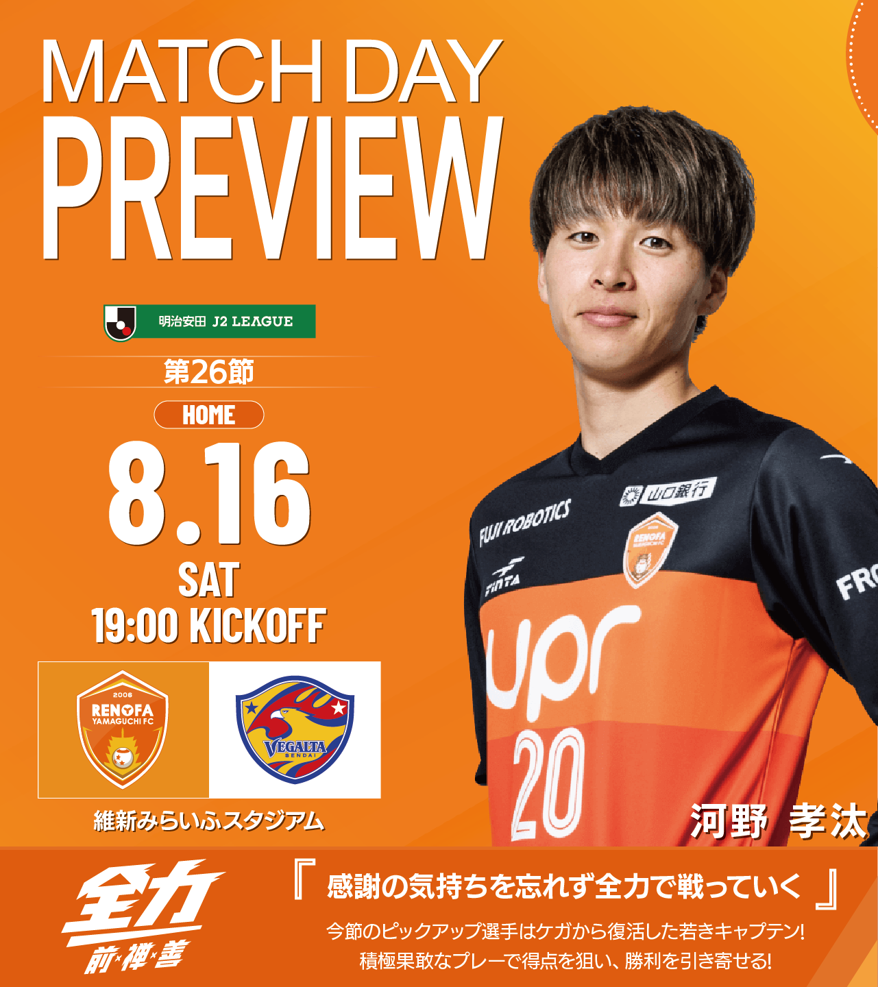 試合は今節も両ゴール前の質をいかに出せるかがカギになる。その意味では主導権はレノファにあり、レノファが決め、レノファが守り切るというサッカーの究極にこだわって90分間を進めることが勝利への早道となる。復活した選手、新加入の選手にも期待が懸かる一戦は、16日(土)午後7時キックオフ。ホームゲームとしては夏休み期間中の最後の試合となる。みんなで最高の思い出を刻む熱戦にしていこう!