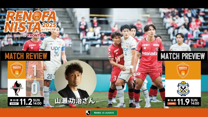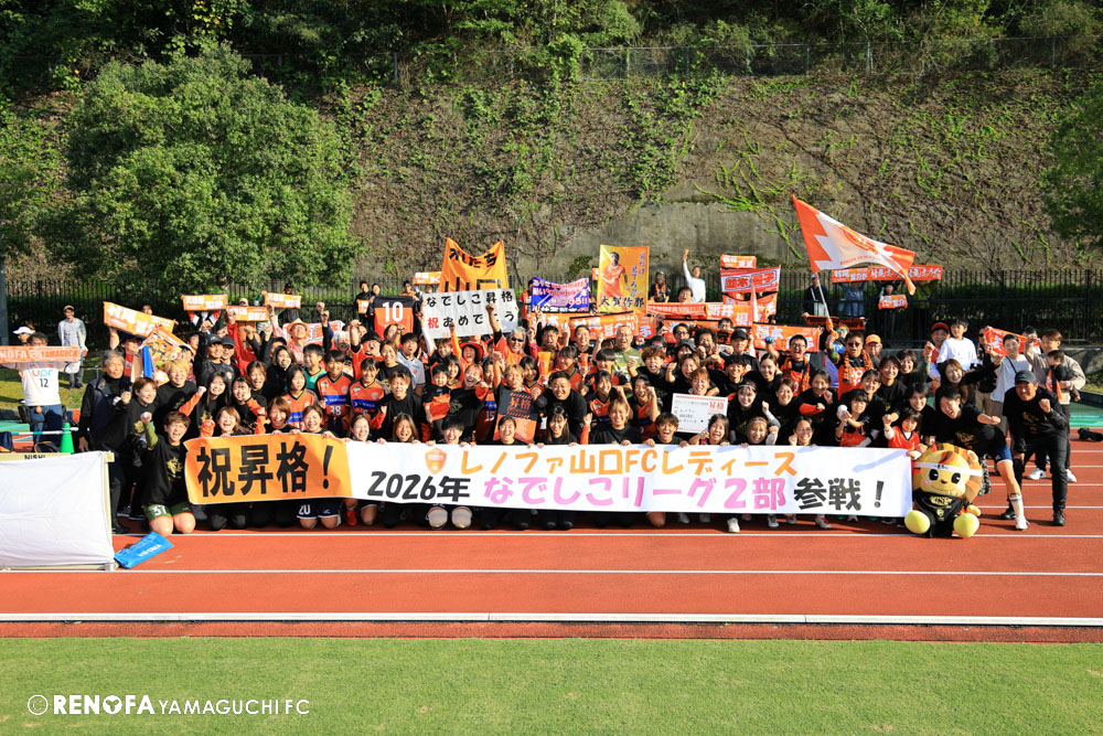 2025プレナスなでしこリーグ2部入替戦で今治FCと1勝1分で参入を決めたレノファ山口FCレディースの「なでしこリーグ参入報告」をハーフタイムに行います。